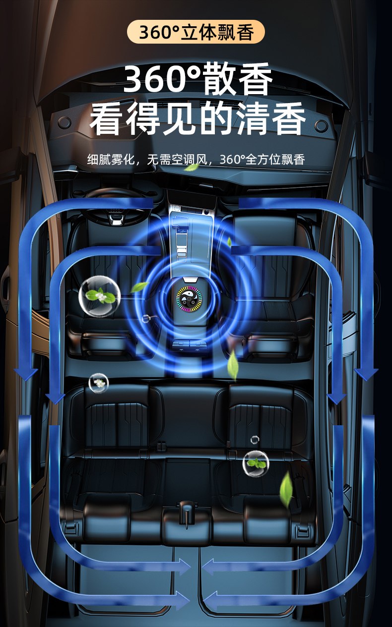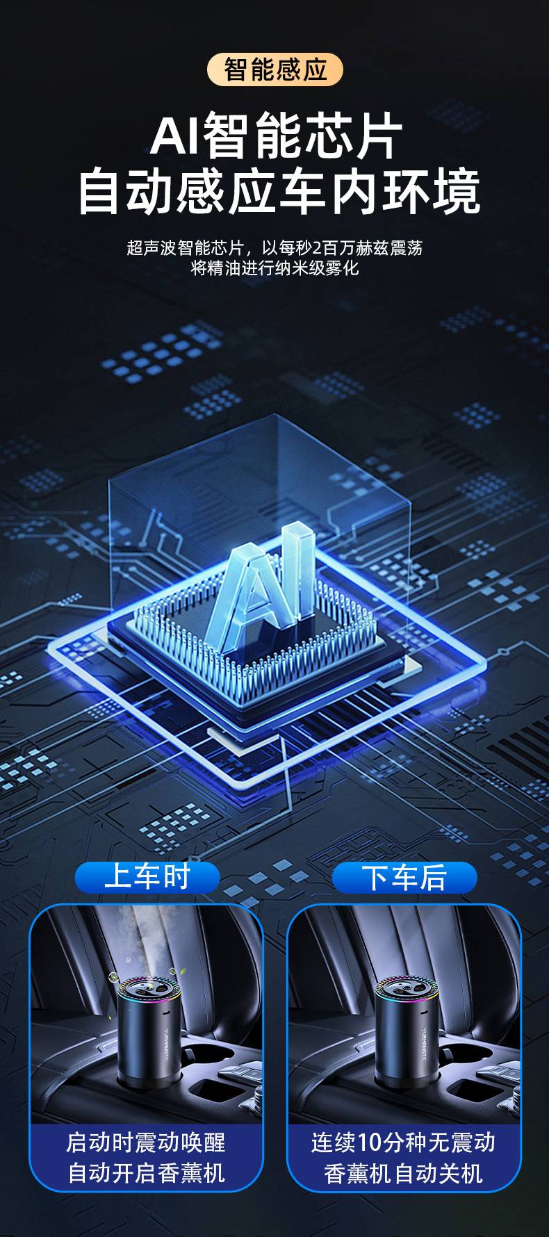 8. Inteligentné snímanie Inteligentný čip AI automaticky sníma ultrazvukový inteligentný čip v prostredí auta a rozprašuje esenciálne oleje na úrovni nanometrov vibráciou 2 milióny hertzov za sekundu